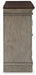 Serve up a sense of traditional cottage design with this dining room server. It features a pair of cabinet doors with inset mirrored glass and decorative fretwork. The server's three smooth-gliding drawers with dovetail construction and black felt bottoms are perfect for storing more delicate items. An antiqued gray body and rich deep walnut brown top, along with bail pulls and knobs finished in a dark bronze tone, complete the beautiful design.