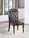 The most festive occasions deserve the most stylish furniture! Finished in brown cherry, the set's rich details include decorative faux wood carvings on the legs reminiscent of baroque styling. The matching chairs feature button-tufted leathered in espresso.